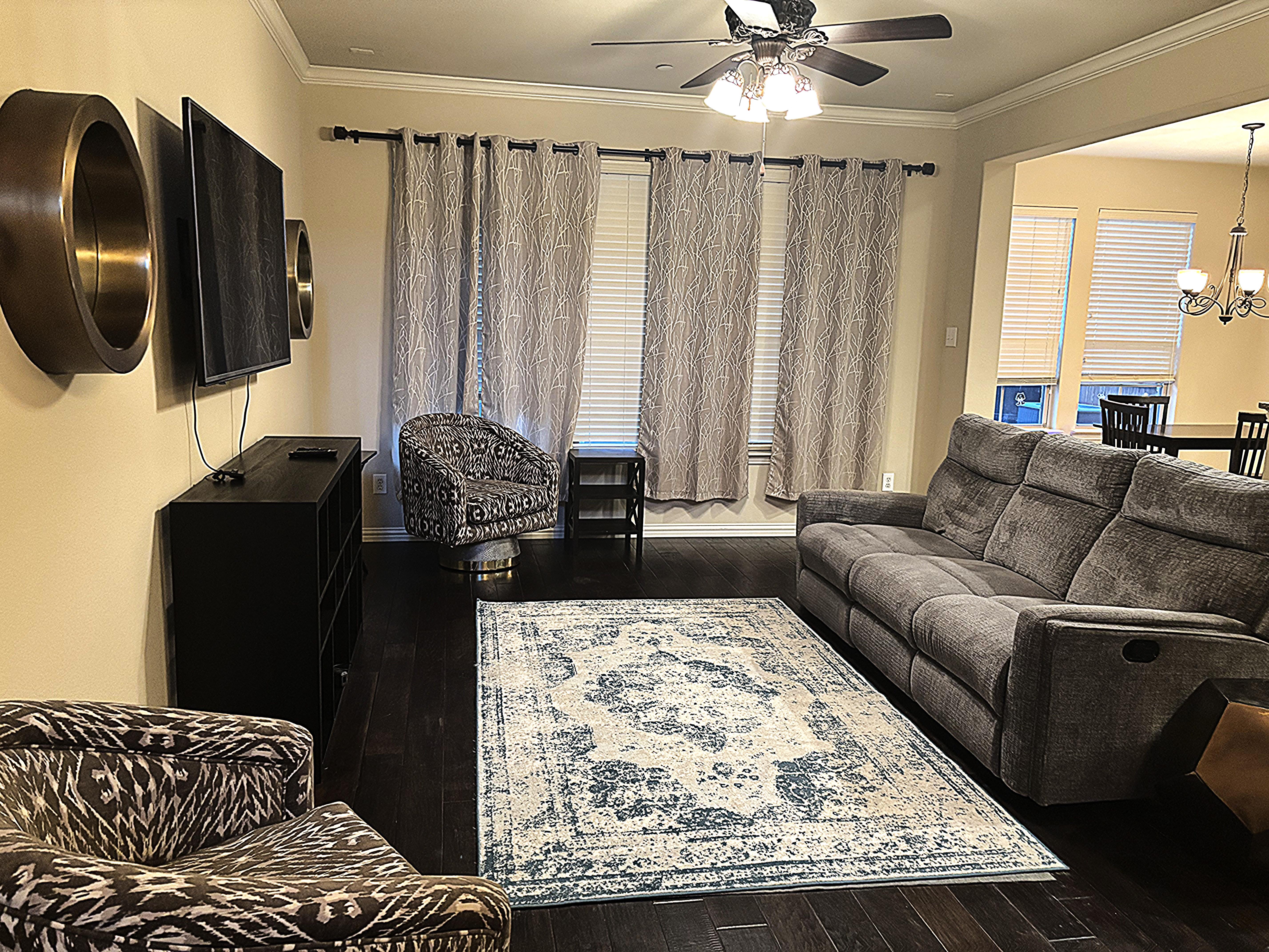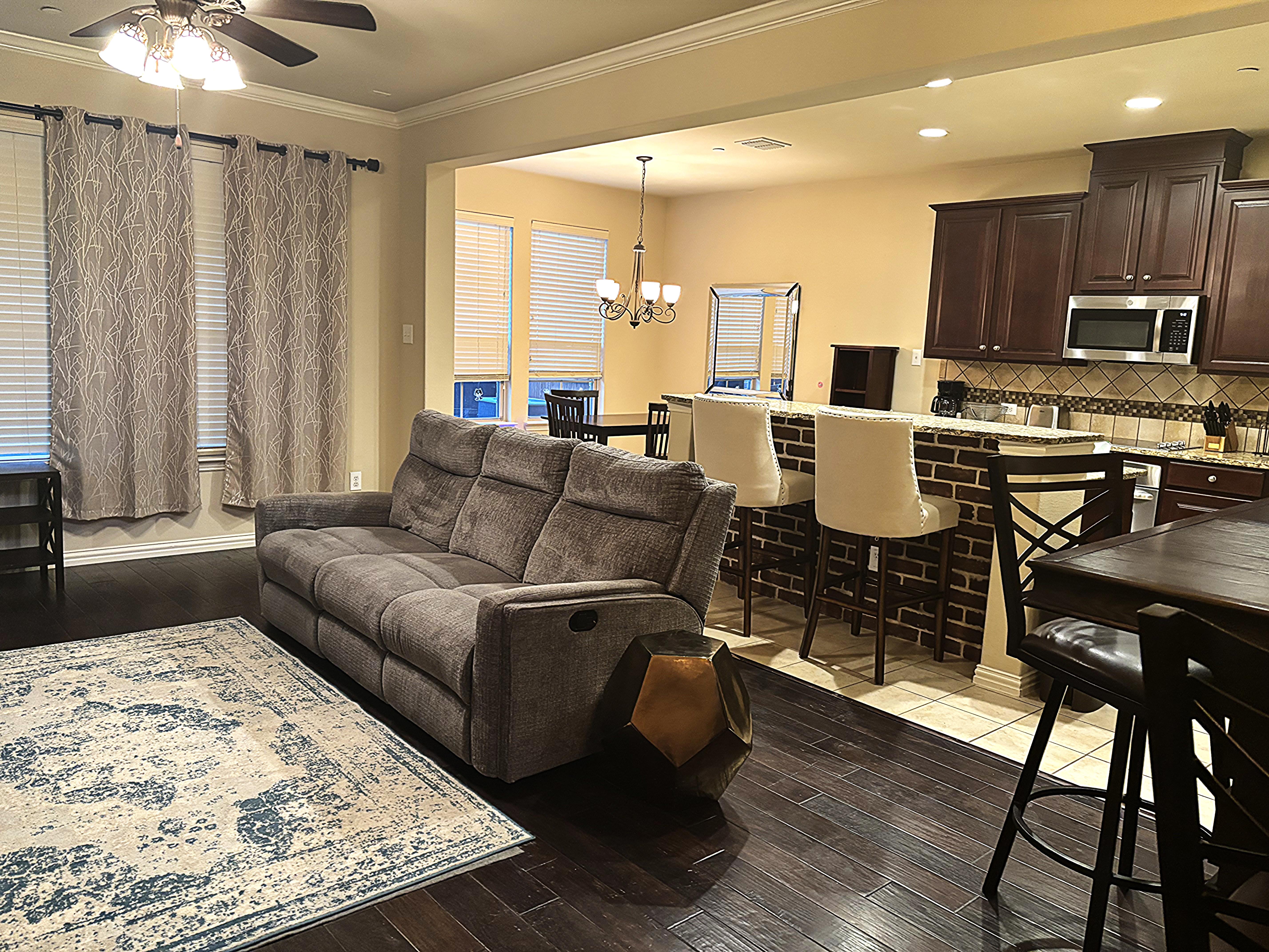- Spacious Living Area: Relax with comfortable seating, a flat-screen TV, and plenty of natural light.