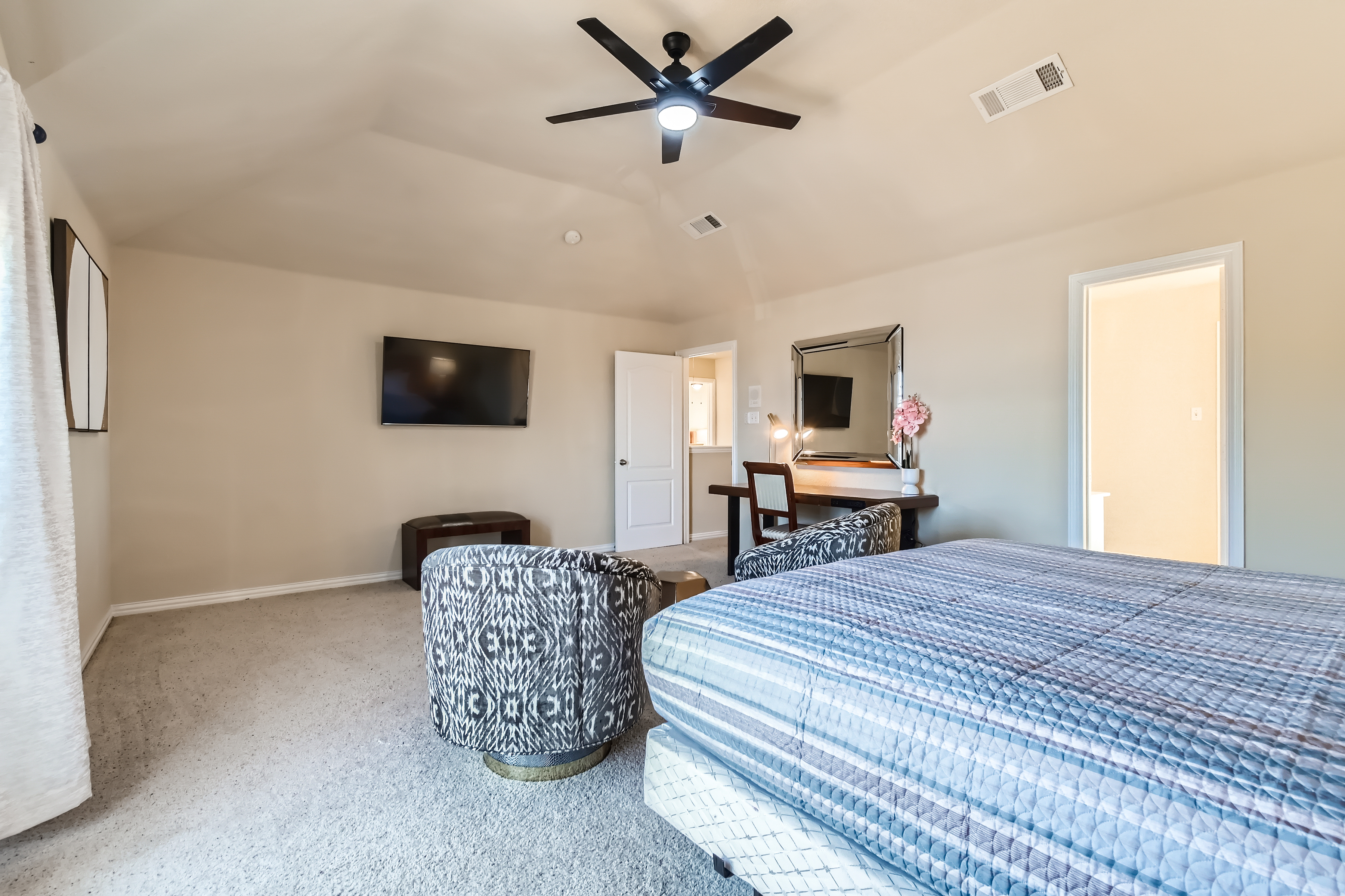- Spacious Living Area: Relax and unwind with plush seating and a large flat-screen TV for movie nights or hanging out with friends and family. Need to get some work done between adventures? A dedicated workspace is perfect for your spring productivity.